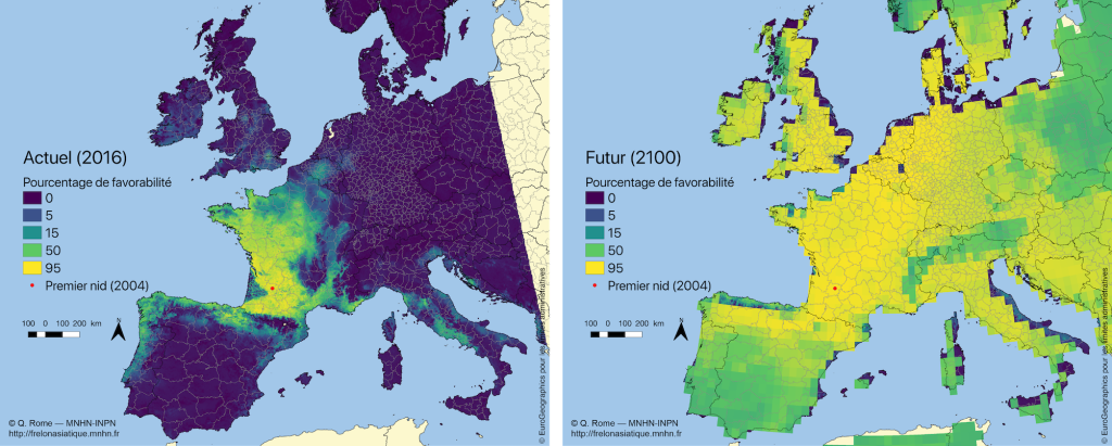 En 2100 dans 75 ans le frelon sera installé partout en Europe occidentale et sera présent dans tous les climats européens.